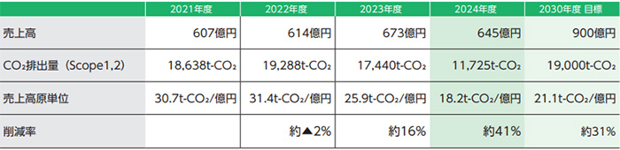 2021年度の当社グループのCO₂排出量を基準とし、中期目標となる2030年度までのCO₂削減目標を設定していました。これはScope1,2排出量のみを対象とし、当排出量から単位売上当たりの排出量原単位を求めて削減目標としました。