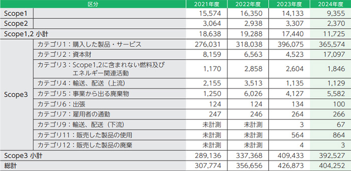 当社グループは2021年度よりグループ全体のCO₂排出量の算定に取り組んでおり、今回、2024年度の排出量を開示いたします。 また今回は、これまでデータの収集や区分けが困難であったScope3カテゴリ9,11,12を前年度まで遡り算出いたしました。