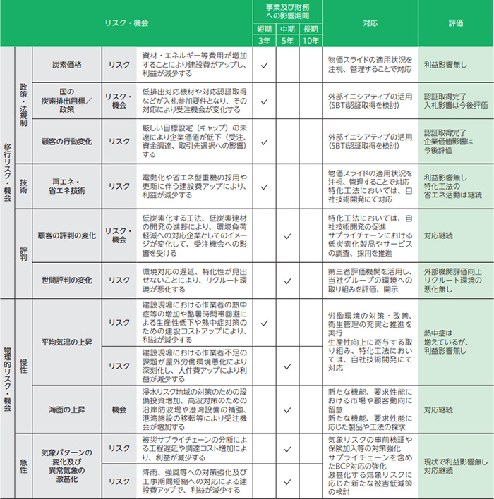 当社グループはリスク管理委員会を設置しており、グループ全体のリスクならびにリスク対策状況及び問題点を把握するとともに、リスク管理に係る方針、施策等を決定のうえ、各担当部署へ指導を行っております。気候関連リスクはサステナビリティ委員会への上程とともにリスク管理委員会にも報告し、当社グループ全体の総合的リスク管理として統合するようにしています。