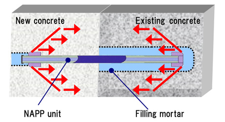 NAPP Anchor Method is a new connecting method for solution. NAPP units fitted at the drilled holes, that can be relatively in small numbers, of the existing concrete structures introduce prestress to the both new and existing structures to be connected.