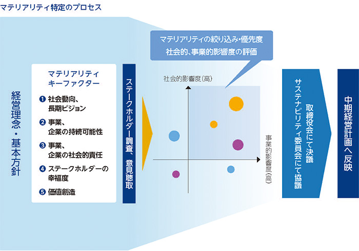 サステナビリティ委員会は、代表取締役社長を委員長とし、社内・社外取締役(監査等委員を除く)、担当執行役員、委員長が定める担当部門長で構成し、2回/年、マテリアリティに対する推進、実行、改善等の実活動に関するモニタリング、評価、方針を審議し、取締役会に上程いたします。