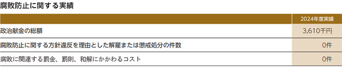 コンプライアンスに関する取り組みとして、『企業行動規範』『コンプライアンス規程』『内部取引に関する規程』を定め社内イントラネットに掲載し周知するとともに、法務コンプライアンス室から当社グループ会社社員宛に『メールマガジン』の配信、『コンプライアンス便り』の掲載、定期テストの実施、『コンプライアンスハンドブック』の掲載を行い、コンプライアンス意識の向上と不正行為と腐敗の防止(贈収賄、優越的地位を乱用した取引、入札談合を含む)に努めております。