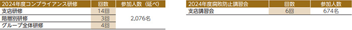 不正行為・腐敗防止(贈収賄、優越的地位を乱用した取引、入札談合など)を含むコンプライアンスの意識の向上を目的とした各種研修を、業務内容や役職、階層別に全役職員に対して実施しています。 特に腐敗防止に関しては、腐敗防止に関する方針を周知すべくグループ全社の安全大会、各支店会議の場を使い、協力会社及び当社グループの全従業員を対象に講習会を実施しています。