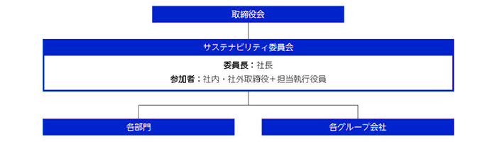 サステナビリティ委員会は、代表取締役社長を委員長とし、社内・社外取締役(監査等委員を除く)、担当執行役員、委員長が定める担当部門長で構成し、2回/年、マテリアリティに対する推進、実行、改善等の実活動に関するモニタリング、評価、方針を審議し、取締役会に上程いたします。
