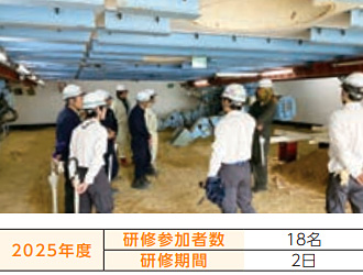 若手職員のほか、グループ会社や協力会社職員を中心に、ニューマチックケーソン工法の技術伝承に意を込め毎年開催。圧気工事の基礎知識と実機設備を使った訓練となっており、現場施工を見据えた研修であるとともに、研修修了者は、圧気工事に必要な特別教育の資格取得につながる有益な内容となっています。